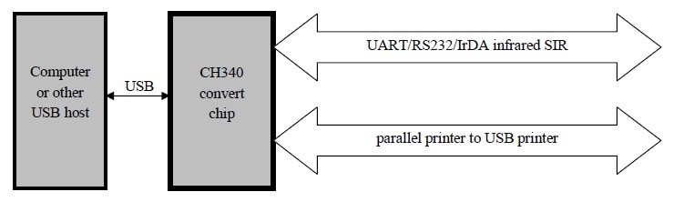 The CH340S is an USB bus convert chip and it can realize USB convert to serial interface, USB convert to IrDA infrared or USB convert to printer interface. In serial interface mode, The CH340S supplies common MODEM liaison signal, used to enlarge asynchronous serial interface of computer or upgrade the common serial device to USB bus directly. In infrared mode, add infrared transceiver to the CH340S can compose USB infrared adapter, realize SIR infrared communication.