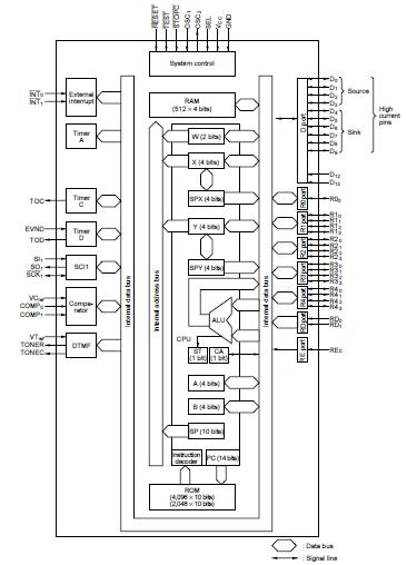 HD404654A21S features: (1)27 I/O pins and 5 dedicated input pins, 10 high-current output pins: Six 15-mA sinks and four 10-mA sources; (2)Three timer/counters; (3)Eight-bit input capture circuit; (4)Two timer outputs (including two PWM outputs); (5)One event counter input (including one double-edge function); (6)One clock-synchronous 8-bit serial interface; (7)Voltage comparator (2 channels); (8)On-chip DTMF generator (fOSC = 400 kHz, 800 kHz, 2 MHz, 3.58 MHz or 4 MHz); (9)Built-in oscillators, Main clock: Ceramic or crystal oscillator (an external clock is also possible); (10)Six interrupt sources, Two by external sources; Four by internal sources; (11)Subroutine stack up to 16 levels, including interrupts.